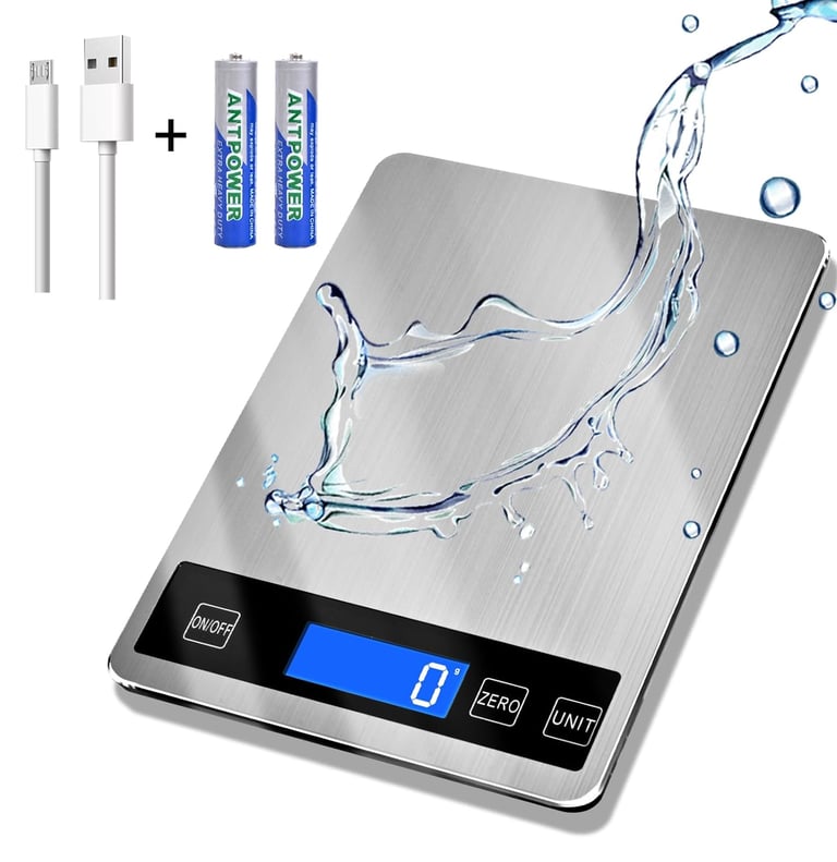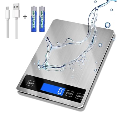 33lb Food Scale, Digital Kitchen Scale Batteries and USB Charging,1g/0.05oz Precise Graduation, Waterproof Stainless Steel with LCD Display Weight Grams and oz for Cooking Baking (Stainless Steel)
